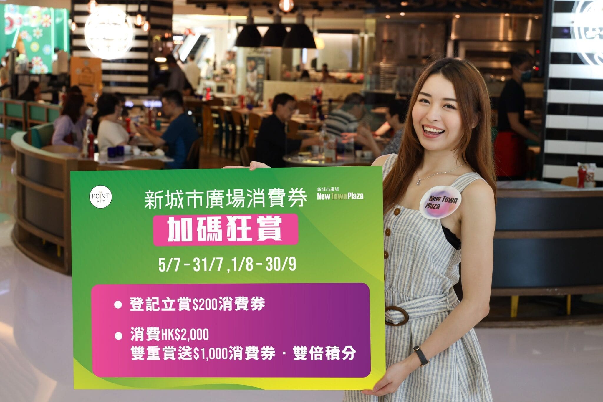 由 7 月 5 日開始,沙田新城市廣場推出兩部曲獎賞計劃,市民於 7 月 5 日起透過任何一家合資格營運商成功登記領取消費券,即可在商場免費獲取新城市廣場三期美妝及時裝商戶總值 $200 元購物消費券。緊接於 8 月 1 日登地的第二部曲「 2,000 元雙重賞」聚焦政府首階段派發的消費券,顧客於場內消費滿 $2,000 即送 $1,000 商場購物消費券,回贈達 50% ,而消費滿 $5,000 則可獲 $1,500 商場購物消費券。