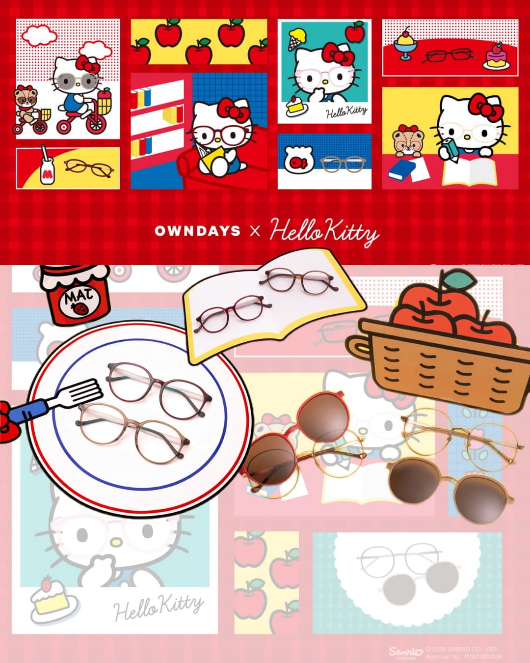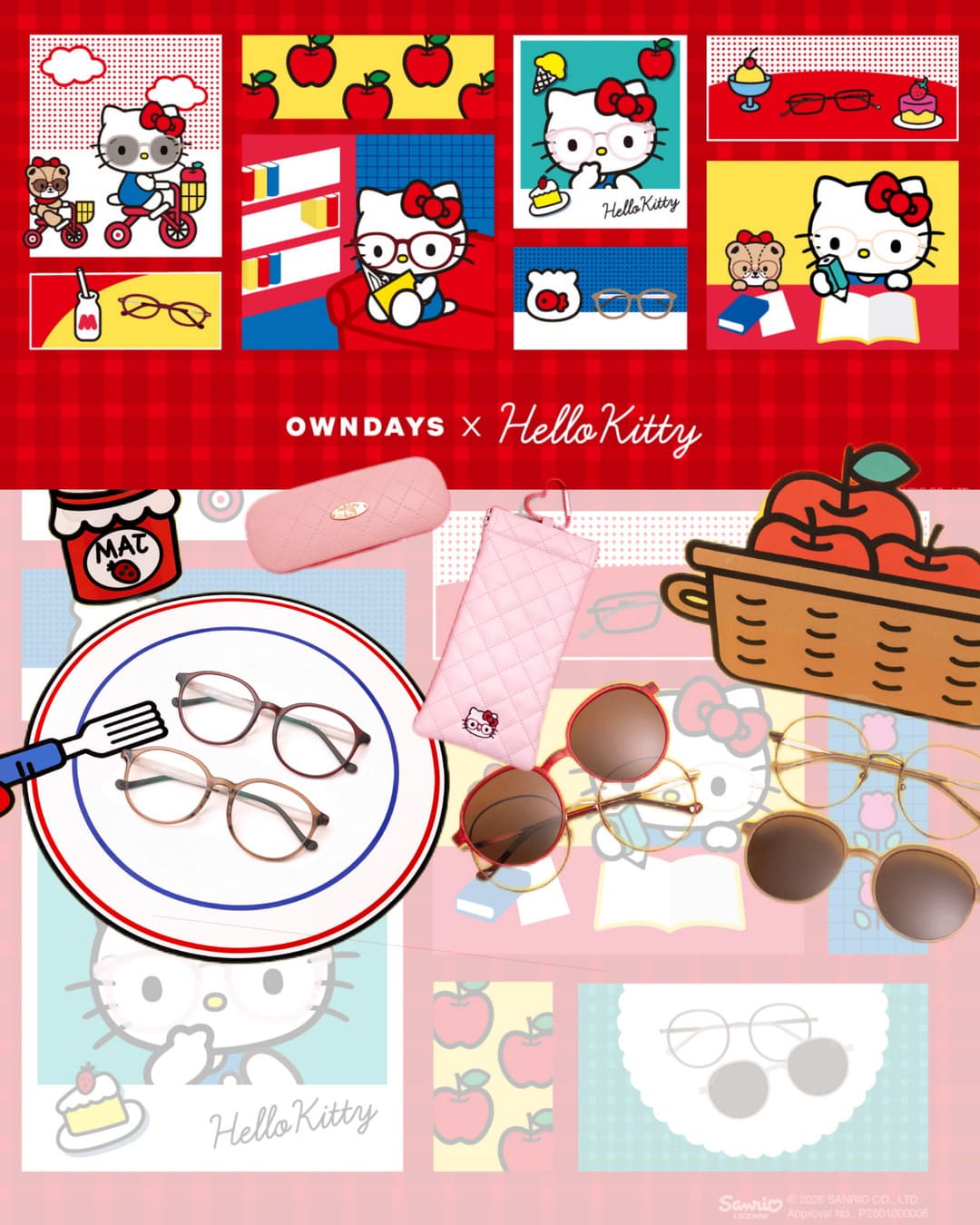 OWNDAYS 與 Sanrio 攜手推出的聯名系列,共推出 8 款不同風格的眼鏡框架,每款均巧妙融入 Hello Kitty 招牌的蝴蝶結、紅蘋果圖案以及可愛臉型細節。其中包括女性喜愛的橢圓形 Ribbon Model,採用金屬亮面材質,色調配備淺粉金及粉紅兩款,鏡臂兩端掛有立體蝴蝶結,左側蝴蝶結中隱約可見 Hello Kitty 探頭身影,設計細膩且低調。Relax Model 則以輕量樹脂打造經典波士頓圓框,鏡臂分別印有「Country」田園及「Kogal」學院主題圖案,配色為紅與咖啡,適合長時間配戴,兼具實用與時尚。Face Model 靈感源自 Hello Kitty 圓潤臉型,威靈頓框正面線條勾勒出蝴蝶結與耳朵,鏡臂則刻有鬍鬚紋理與臉型剪影,提供透明及淺粉色選擇。最新的 Going-Out Model 採用圓框設計,配備磁吸 SNAP 鏡片,能瞬間轉換成太陽眼鏡,鏡片邊框刻有 Hello Kitty 標誌及蝴蝶結,鏡臂融入蕾絲細節及立體蘋果圖案,色彩有霧面紅及咖啡色,外出造型引人注目。