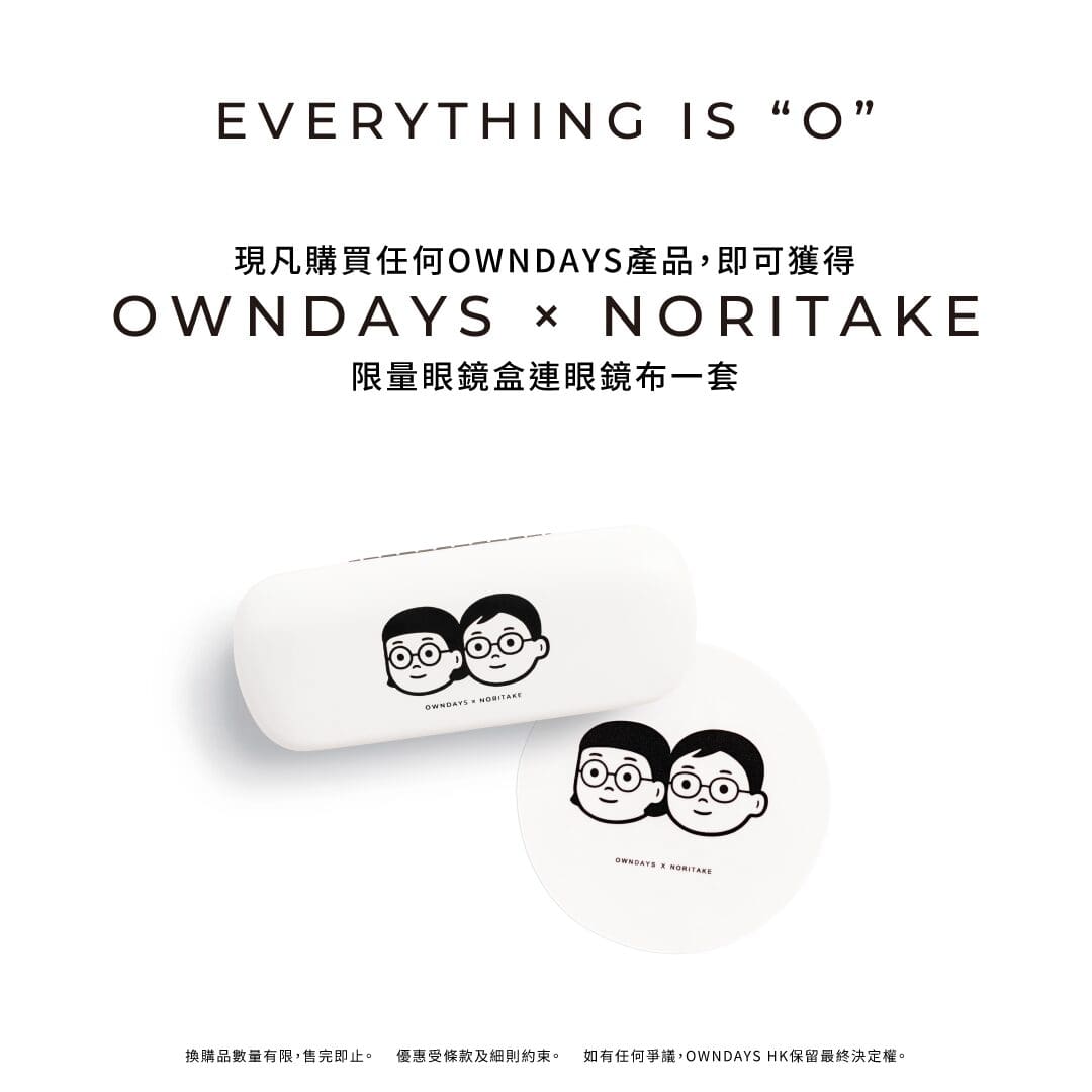 OWNDAYS 提供全面的產品零售、完善的全球保養計劃,今次更與同是日本品牌的 NORITAKE 合作聯乘企劃—— 《 Everything is “O” 》,為顧客帶來全新驚喜,皆因這是 NORITAKE 筆下標誌性的人物全港首次與眼鏡品牌合作,亦首度以配戴上「O」 (圓) 形眼鏡的可愛造型亮相,寓意著 OWNDAYS 的「 O 」字同時,亦代表 OWNDAYS 獨有的最強賣點 — 無論任何度數,均可以「$O」免費升級薄型非球面鏡片,就是只需付上鏡框上標示的價格,即可以免費擁有最適合自己的鏡片!
