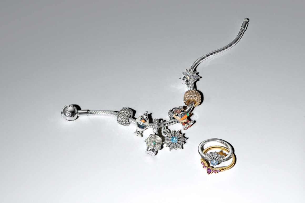 《魔雪奇緣》系列以冰藍色鋯石與雪花造型為主調。愛莎女王冠冕戒指與雪花吊飾各定價港幣 $799,而迪士尼公主系列故事書扣蛇形手鏈定價港幣 $1,799,是系列中最完整的一件單品,適合用來建構個人化的 Pandora 手鏈造型。Elsa 所代表