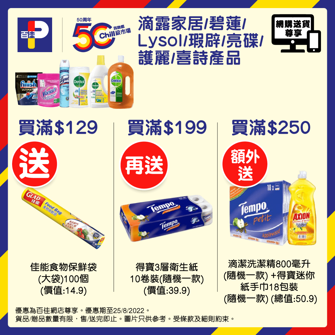 天氣不穩,當然要做定準備買入所需!百佳網店即日起推出優惠,其中購買滴露家居/碧蓮/ Lysol /瑕辟/亮碟/護麗/喜詩產品滿 $129 送佳能食物保鮮袋(大袋) 100 個、買滿 $199 送得寶三層衛生紙 10 券(隨機一款)、買滿 $250 額外送滴潔-滴潔洗潔精 800 毫升(隨機一款)及得寶迷你紙手巾 18 包裝(隨機一款)。另外即日起至 8 月 25 日到全線百佳購買 $1,500 送總值 $300 優惠券。