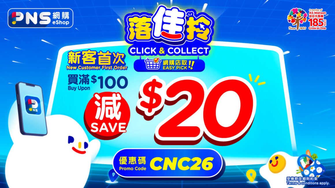 即日起至 2026 年 6 月 30 日,凡首次使用 PNS 網購並消費滿港幣 $100,輸入優惠碼【CNC26】即可全單減港幣 $20,體驗網購店取的便利服務。