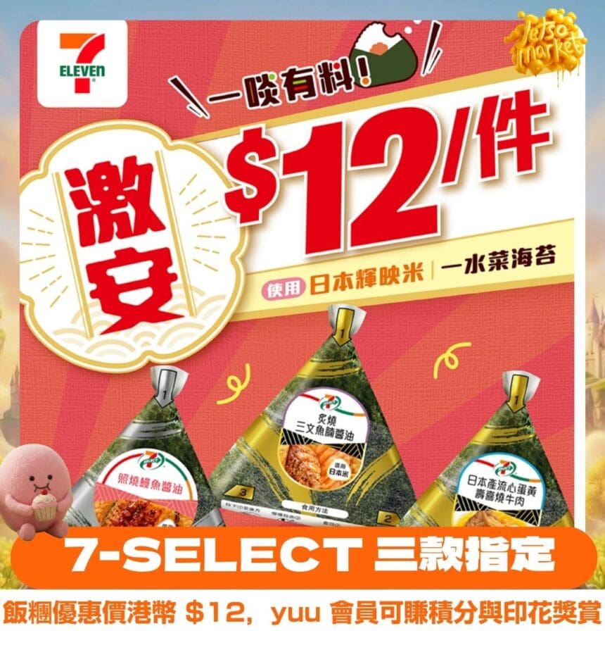 7-SELECT 飯糰三款指定口味限時優惠價港幣 $12,yuu 會員還可賺積分與印花獎賞…( 19/1 至 21/1 )