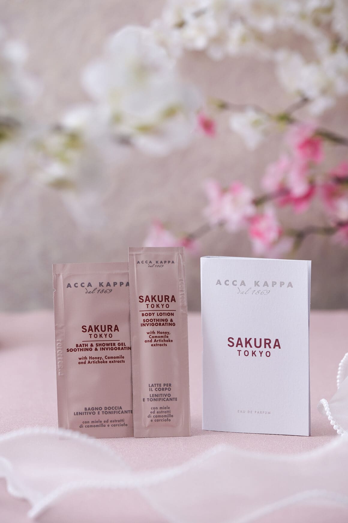 ACCA KAPPA「Sakura Tokyo」香水專為捕捉櫻花自然之美及氣息,甜美優雅。香氛前調為日本白梨與橙花,中調融入小蒼蘭、睡蓮、玫瑰與櫻花的花香,基調結合天芥菜、檀木與麝香,演繹層次豐富的氣息。價格分別為港幣 $1,150(100ml)、港幣 $770(50ml)及港幣 $280(15ml)。同系列的 SAKURA TOKYO 美肌精華油採用六種活性植物精油配方,深層滋養肌膚,售價為港幣 $560 / 100ml。而融合高品質植物油、洋甘菊萃取及蜂蜜的櫻花身體潤膚露則有助平衡肌膚彈性及緊緻肌膚,售價為港幣 $380 / 300ml。