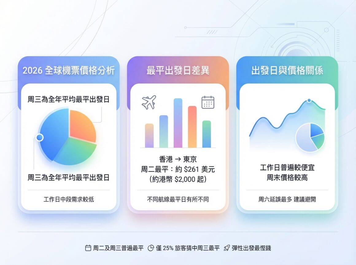 「周三最平」是整體趨勢,但具體最平日期因航線而異。以香港出發的熱門航線為例,根據 momondo 數據,香港出發飛東京最平出發日為周二,最低票價約 $261 美元(來回約港幣 $2,000 起)。整體而言,周二及周三普遍是最平的出發日,而周六則是延誤最多的出發日,建議盡量避開。