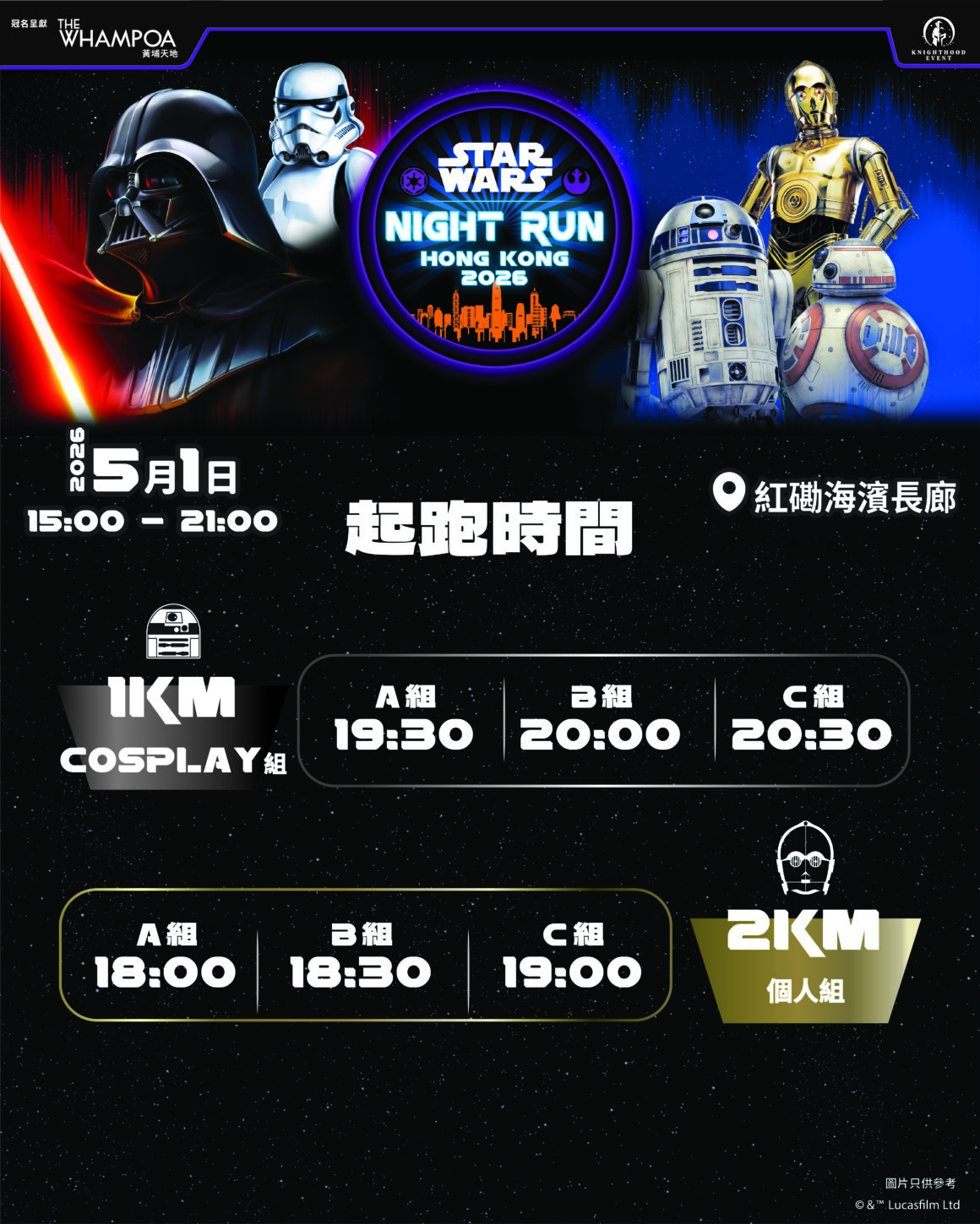 呼應《星球大戰》經典設定,STAR WARS Night Run 2026 將首次在夜晚舉行,開創前所未有的主題夜跑。賽事分為 1 公里 Cosplay 組及 2 公里個人組兩大組別。Cosplay 組邀請粉絲化身 Luke Skywalker、黑武士、尤達大師等經典角色,上演絕地與西斯的對決,將黃埔海濱打造為充滿氣氛的星戰銀河世界。2 公里組則適合想輕鬆挑戰的跑手,跑道沿途美麗夜景令體驗更佳,期間更有帝國501軍團驚喜助陣,為跑者加油打氣,注入滿滿原力。