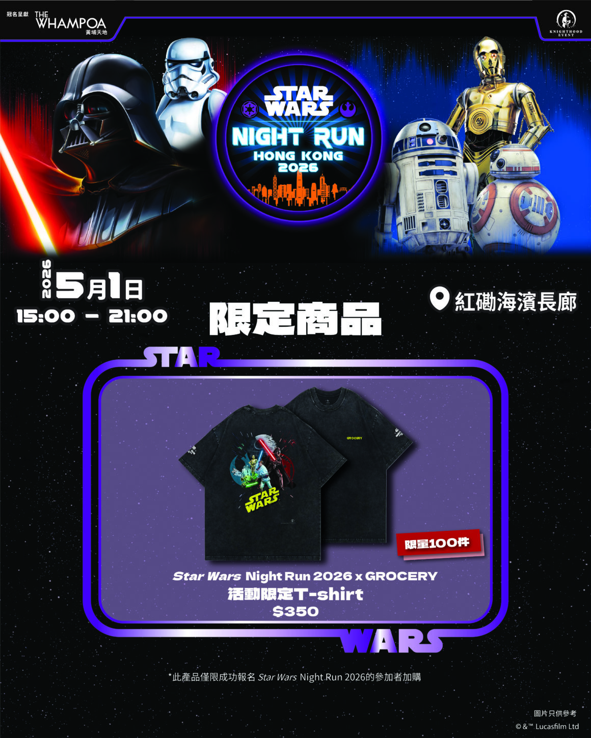 活動與本地品牌 GROCERY 合作,推出限量 100 件 STAR WARS Night Run 2026 特製洗水 T-shirt。此款T-shirt 採用重磅洗水布料,搭配星戰經典對決畫面,具復古潮流感。T-shirt 僅向成功報名的跑手提供加購機會,定價港幣 $350,數量有限,喜愛星球大戰的粉絲不可錯過。