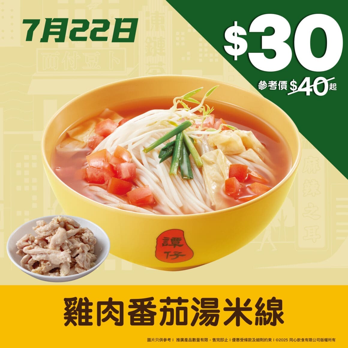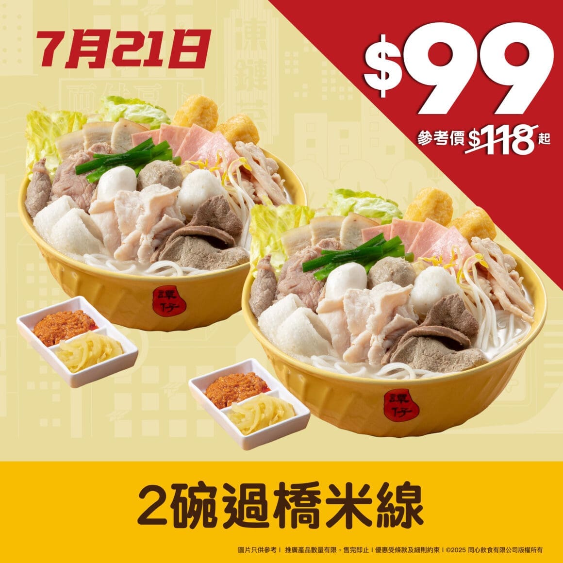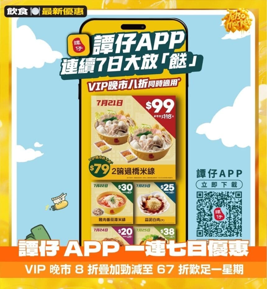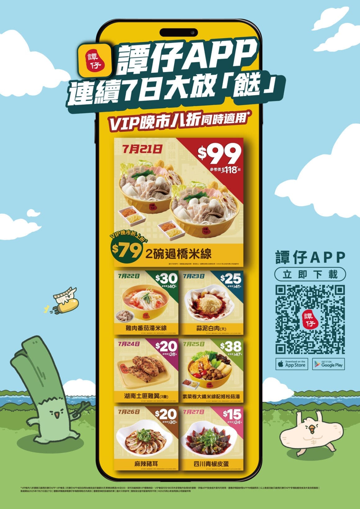 譚仔雲南米線推出手機 APP 後再送驚喜,2025 年 7 月 21 日至 27 日期間連續 7 日送上每日限定優惠,主打人氣米線及小食低至港幣 $15 起。會員如屬 VIP,更可同時使用晚市 8 折券,一次過疊加優惠,歎盡過橋米線、蒜泥白肉、土匪雞翼等皇牌美食。
