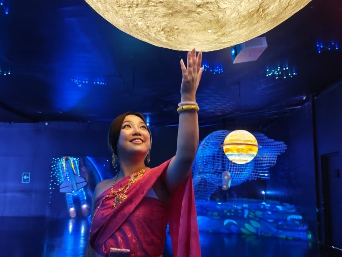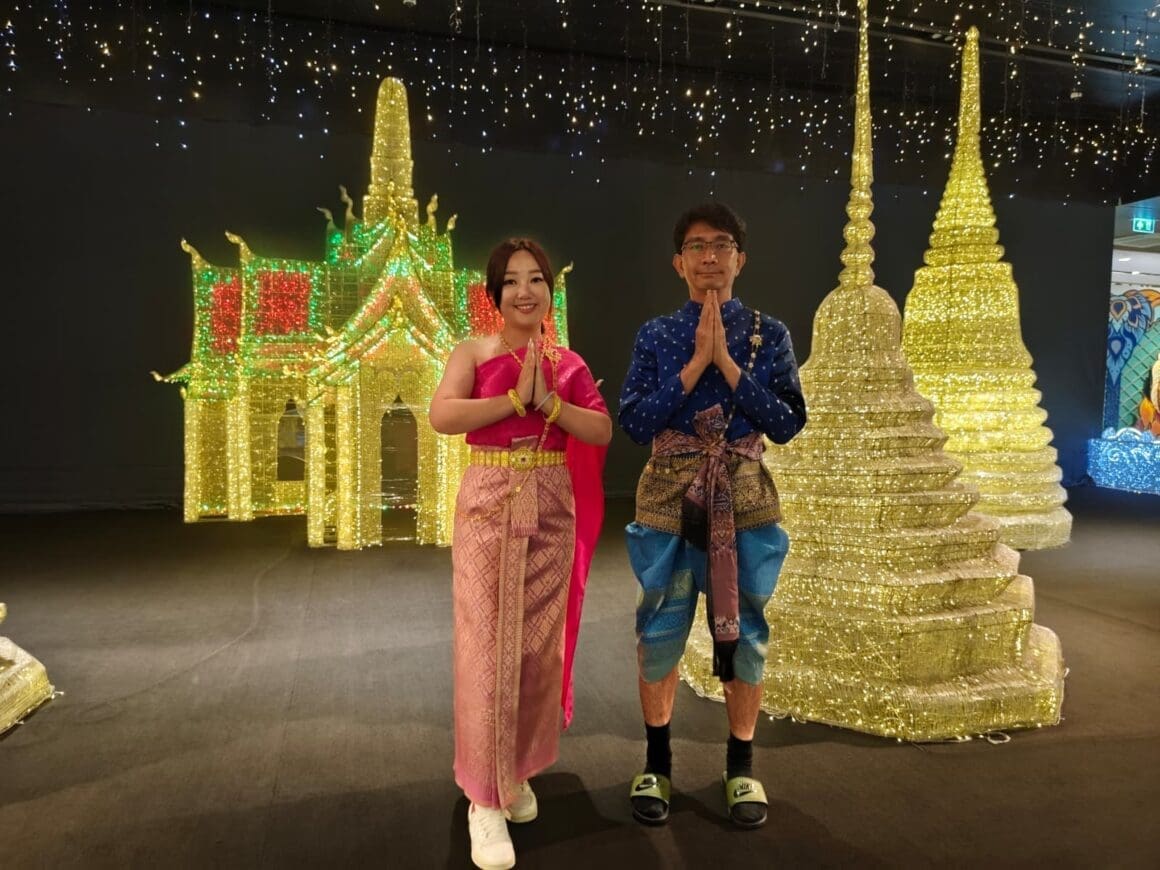 第一站來到燈光藝術博物館,妹頭笑言這是「自由行絕不會來的地方」,還忍不住吐槽場地氣氛冷清、舞者表情僵硬。反觀阿正則認真研讀展板,試圖尋找文化價值。二人最終「入境隨俗」,以 300 泰銖租借泰服拍照,學講幾句泰文,卻仍難掩尷尬。妹頭以一句「笑都硬咗」總結評價,全場爆笑。