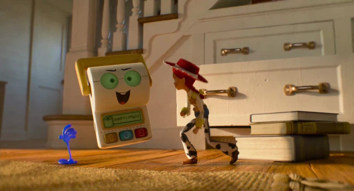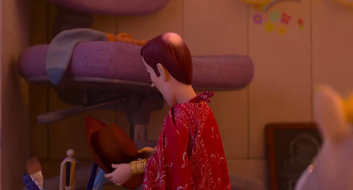翠絲透過對講機聯絡胡迪求助。鏡頭一轉,他披著棕色披風、穿著舊牛仔褲現身。這當他脫帽的一刻,頭頂禿斑反射陽光,令夥伴一時語塞。彩姿(Trixie)打趣指需要棕色筆補一補,莉莉平板更直言嘲諷「老頭玩具」,小叉則天真補一句「因為你禿頭」。這個設計既帶幽默感,又象徵歲月流逝。胡迪不再是永遠完美的牛仔,他的禿頭彷彿成為「舊時代」的標記。預告中科技玩具如 Smarty Pants(由康南奧拜仁聲演)加入陣營,對傳統玩具構成壓力。世代衝突,正式展開。