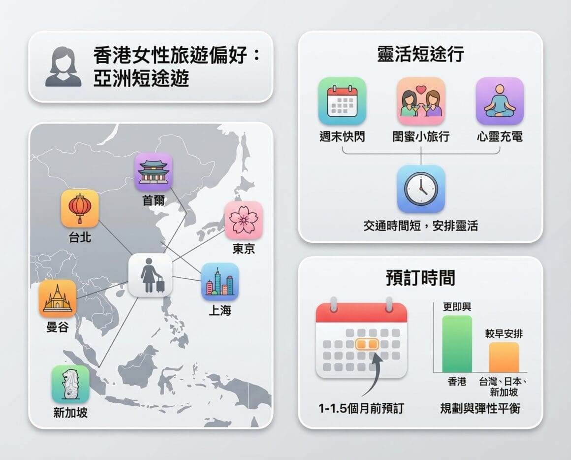 從 Trip.com 航班數據可見,香港女性仍然最偏好亞洲短途旅遊,最受歡迎城市包括台北、首爾、曼谷、東京、上海及新加坡。這類近程城市交通時間較短、安排較靈活,無論是週末快閃、閨蜜小旅行,還是臨時想放假的「心靈充電之旅」,都更容易成行。