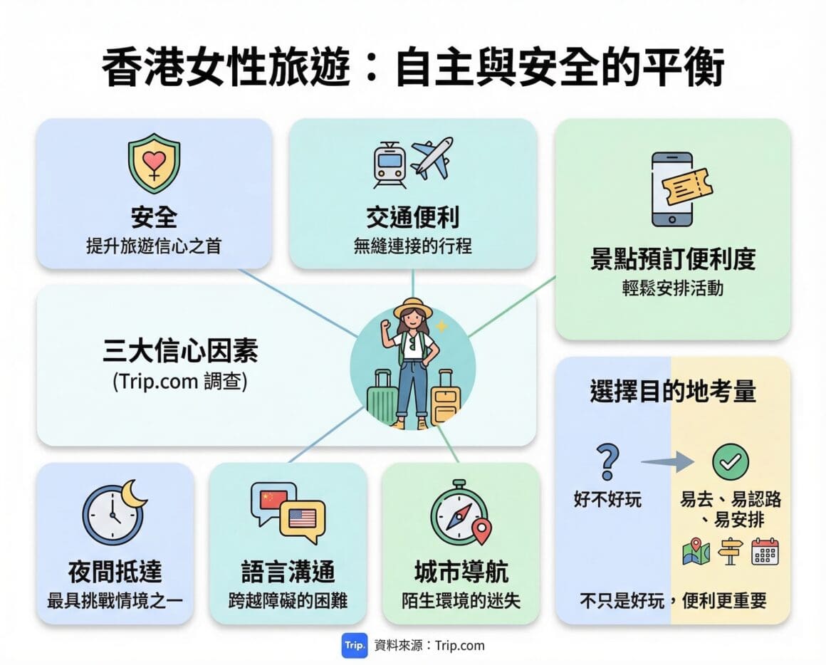 雖然香港女性旅遊態度愈來愈自主,但安全與便利仍然是最重要考量。Trip.com 調查顯示,「安全」、「交通便利」及「景點預訂便利度」是最能提升女性旅遊信心的三大因素。