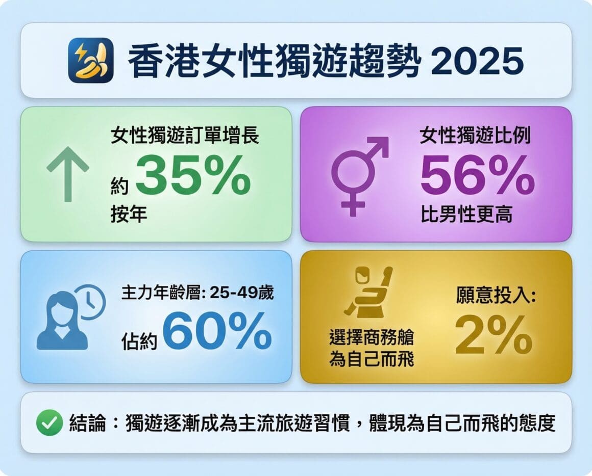 值得留意的是,當中有 2% 女性獨遊者選擇商務艙,反映部分旅客願意為舒適度與旅遊品質投入更多,亦體現出「為自己而飛」的消費態度。