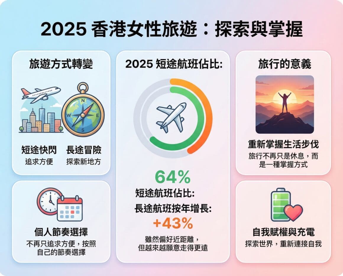 由短途快閃到長途冒險,女性旅客不再只追求「方便」,而是更願意按照自己的節奏選擇想去的地方。對不少人而言,旅行不再只是休息,而是一種重新掌握生活步伐的方式。