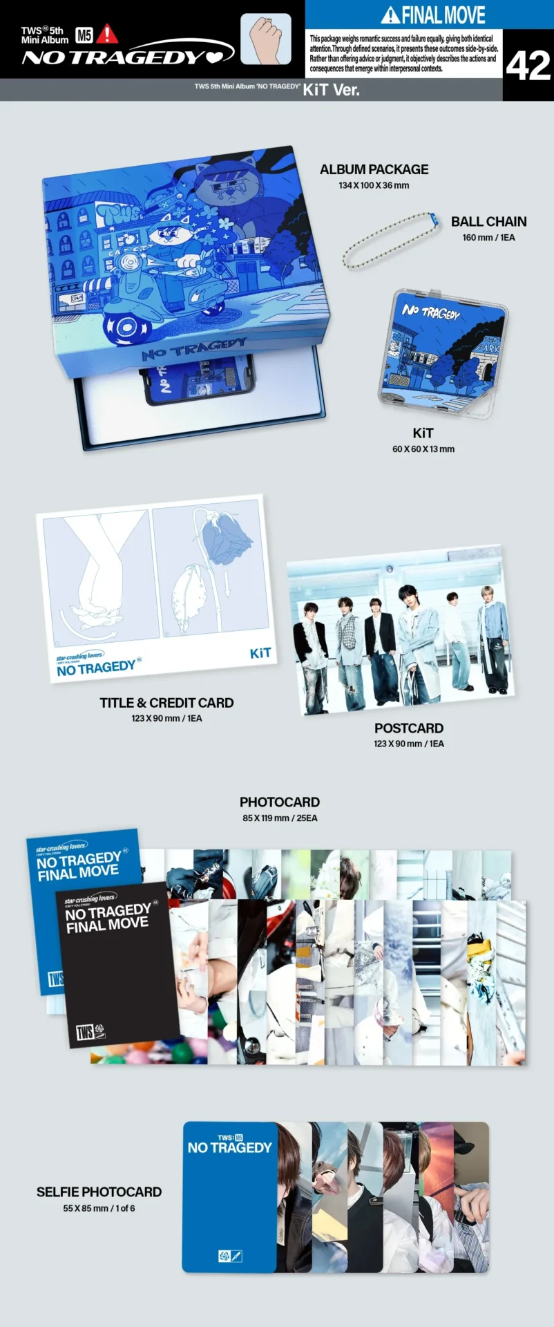 從《Sparkling Blue》、《SUMMER BEAT!》到《TRY WITH US》、《play hard》,TWS 過去一直以清爽、輕盈的少年感為主軸。但今次《NO TRAGEDY》在命名上已明顯轉向,不再單純描繪青春,而是帶有一種「面對現實仍然選擇向前」的態度。「No Tragedy」不只是字面上的否定,更像是一句宣言——即使面對困難,也拒絕讓故事變成悲劇。這種語氣,意味著 TWS 正開始處理更深層的情感與成長議題。