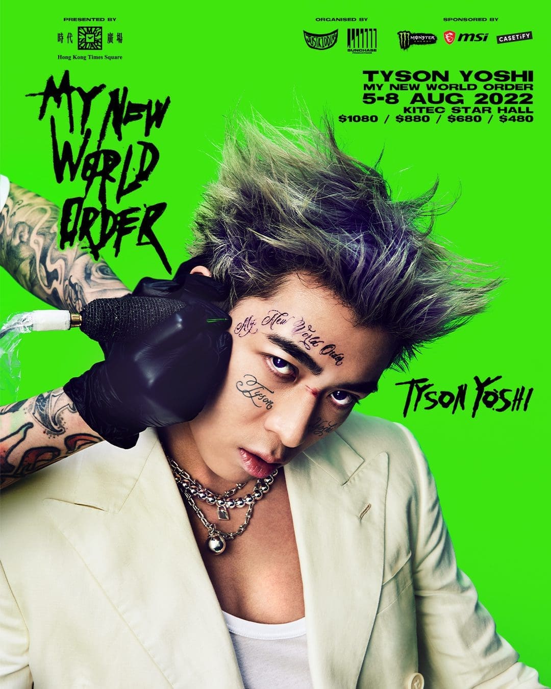 歌手 Tyson Yoshi 日前將社交媒體帳號的個人圖片轉成綠色,連姜濤、 Serrini 、林家謙都有響應;今日 Tyson Yoshi 終於解開「綠色之迷」,原來是為其個人首個個人大型演唱會宣傳,而官方更公佈 Tyson Yoshi 《 MY NEW WORLD ORDER 》演唱會落實於 8 月 5 日起於九展 Star Hall 連開四場,門票將於 6 月 17 日早上十點於快達票網站以實名制公開發售,並不另設售票處。