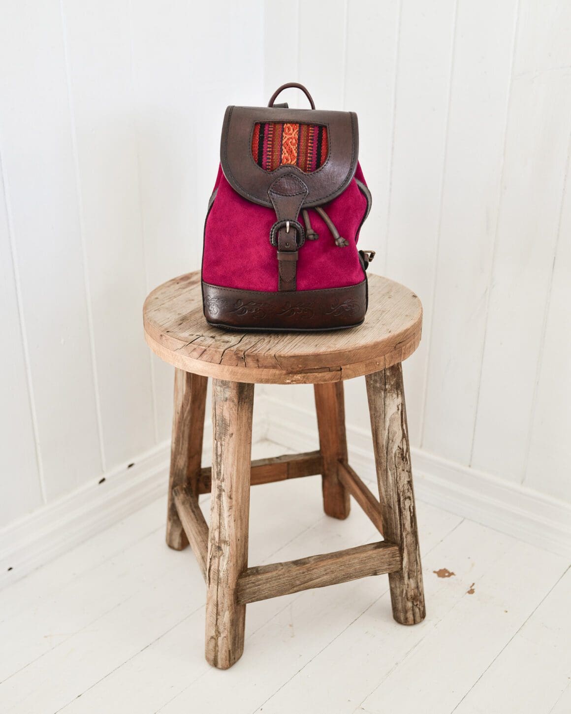 「Bambina」 皮革背包用上紅色绒面革配上紅色皮革,全牛皮製造,前面用上充滿安第斯風格的布料圖案,適合一眾喜歡走民族風的男女生,布料更是手工編織,絕對是獨一無二及限量。