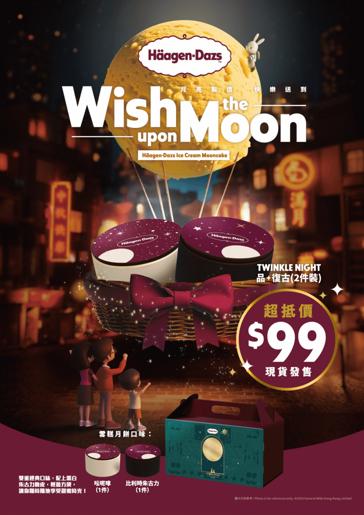 今年 Häagen-Dazs 推出「Wish Upon The Moon」雪糕月餅系列,限時優惠包括最後階段低至 65 折、選購 2 盒再享 9 折,以及加購指定款式低至港幣 $288。另外,更有「品・復古」雪糕月餅(2 件裝)限時 $99,即買即享。