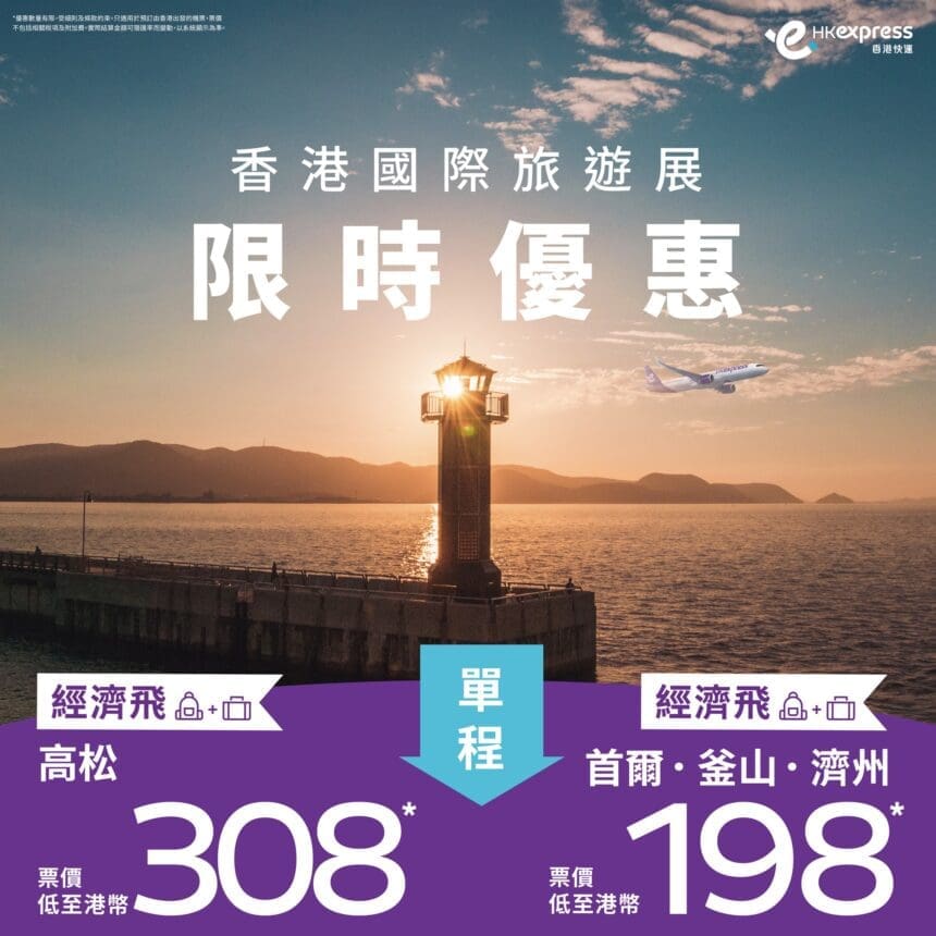 一年一度的香港國際旅遊展即將到來,HK Express 香港快運為大家送上限時優惠機票!高松「經濟飛」單程票價低至港幣 $308 ,讓你慢節奏體驗當地文化。首爾、釜山、濟州「經濟飛」單程票價低至港幣 $198 ,發掘數不盡的景點和隱世美食。