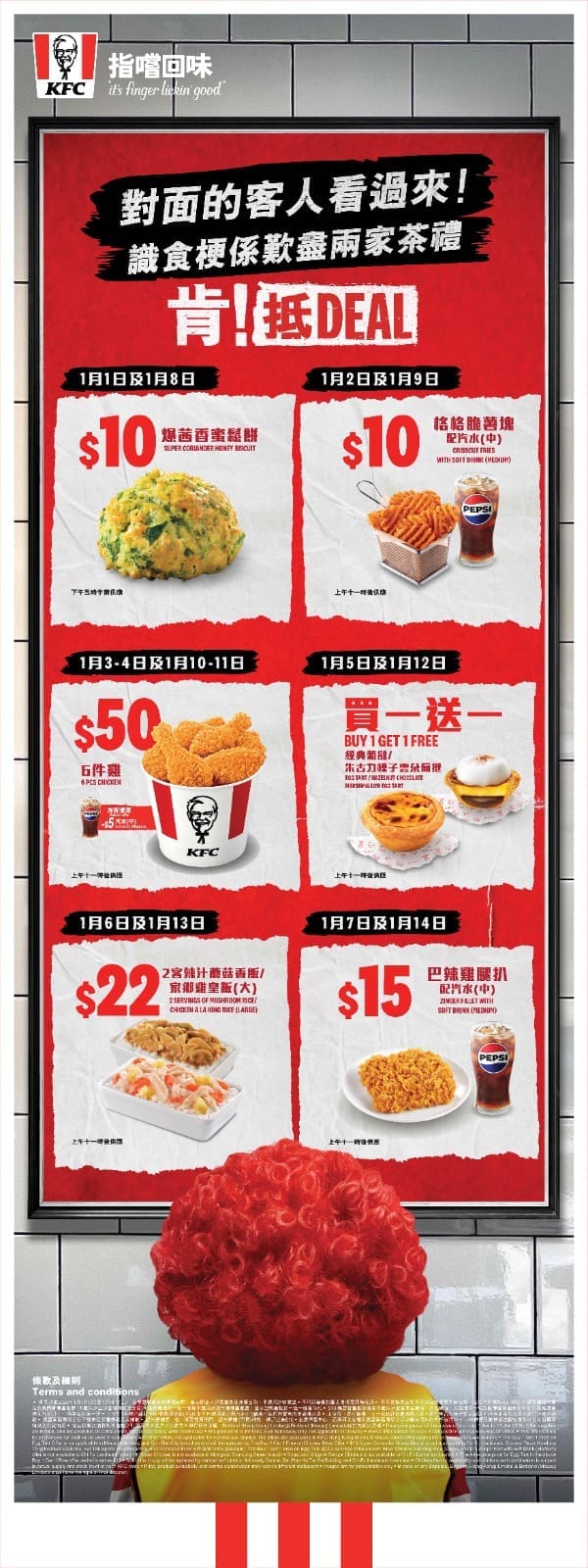 由 2026 年 1 月 1 日開始至 14 日,KFC 每天推出不同限時折扣,讓你輕鬆組合理想餐點。元旦當天及 1 月 8 日下午 5 時 30 分前,限定供應「爆茜香蜜鬆餅」每件僅售港幣 $10(置富南區廣場、赤柱廣場、九龍塘又一城及啟德體育園分店除外),鬆餅外層香脆,內裡柔軟,濃郁的芫茜香氣令人回味無窮。1 月 2 日及 9 日上午 11 時後,提供「格格脆薯塊配中汽水」組合,售價港幣 $10(置富南區廣場分店除外),打造自製小食套餐。週末和下週同樣時間,1 月 3 至 4 日及 10 至 11 日,推出經典「六件雞」套餐港幣 $50,再加 $5 可配汽水(旺角山東街不供應狂惹香燒雞,置富南區廣場分店不供應狂惹香燒雞及家鄉雞)。 KFC 精心策劃多款優惠,適合多元口味選擇,帶來超抵價值享受。