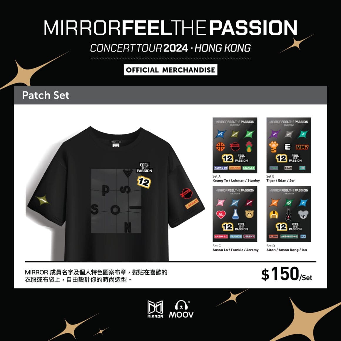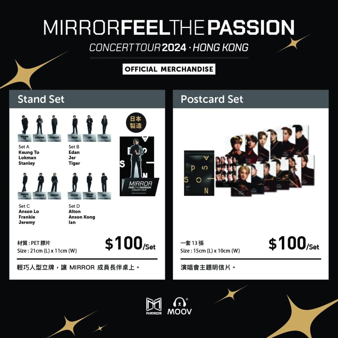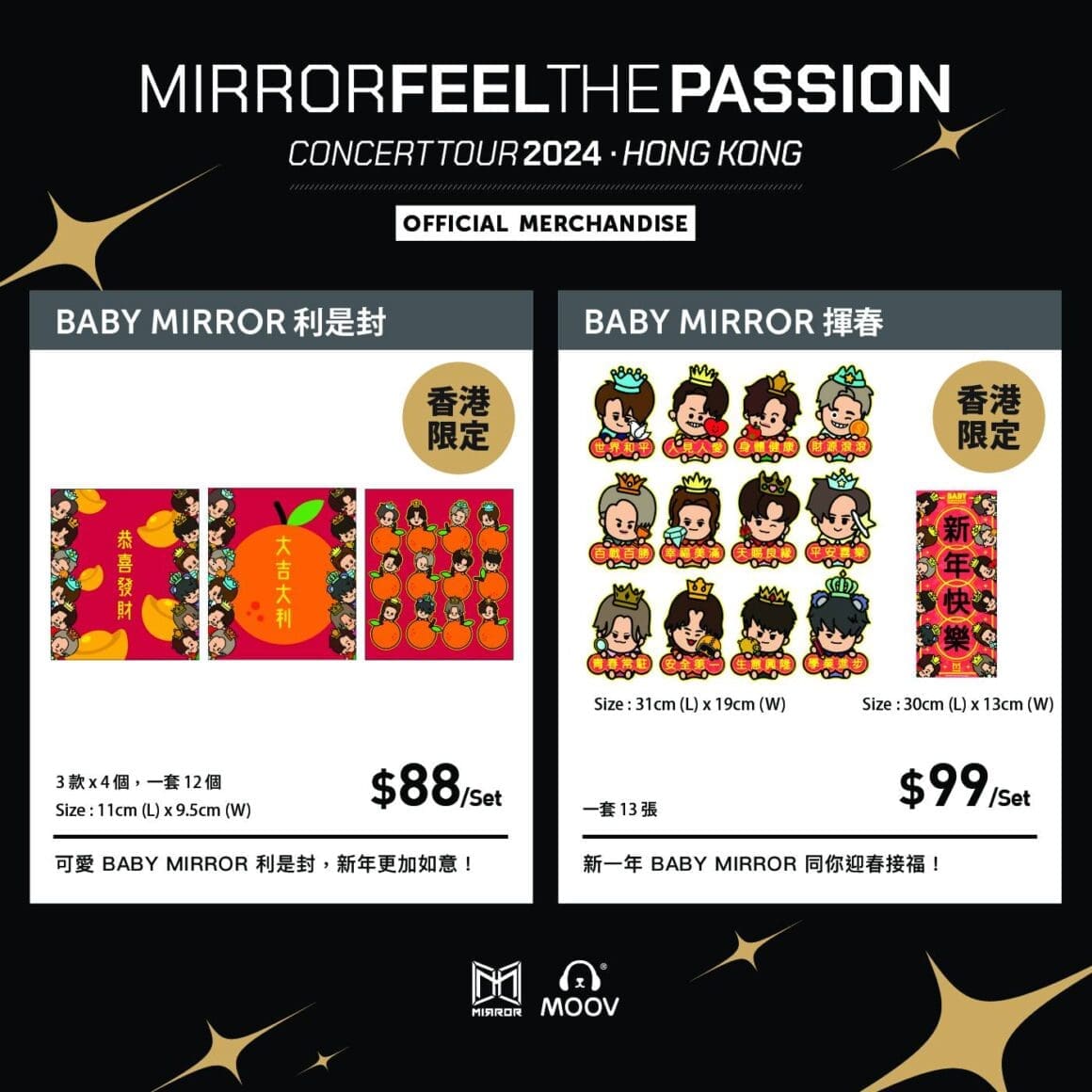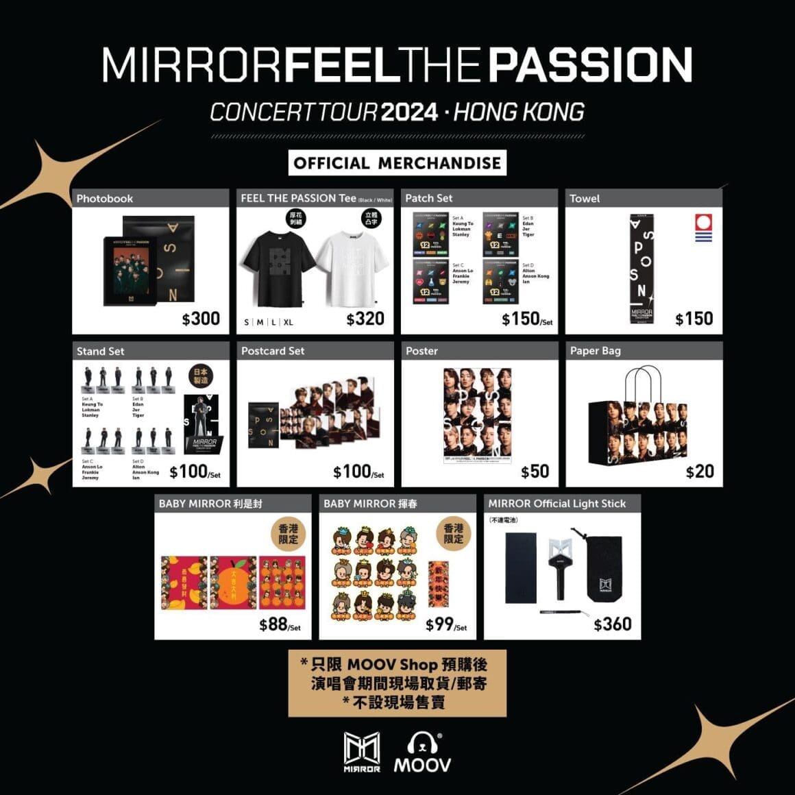 MIRROR 成軍五年,演唱會期間場內設周邊產品取貨及郵寄區域,包括 Photobook 、 T 恤、毛巾、海報、紙袋、 BABY MIRROR 利是封及揮春等;場內亦發售 3 種套裝。所有演唱會周邊商品將於 MOOV Shop 進行預購,於演唱會現場取貨或郵寄。演唱會現場將不設售賣處。所有周邊商品數量有限,售完即止。