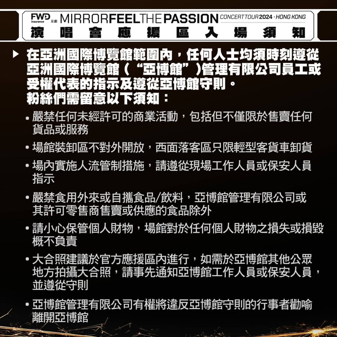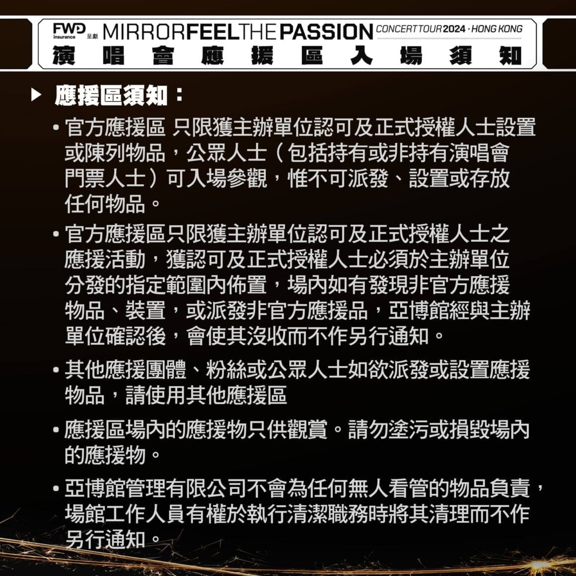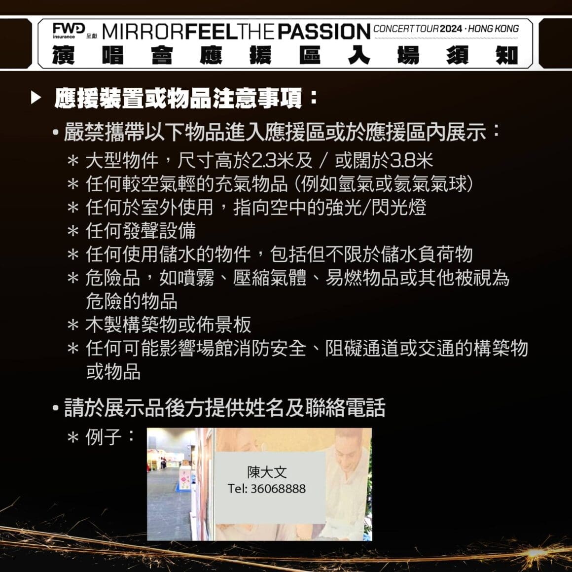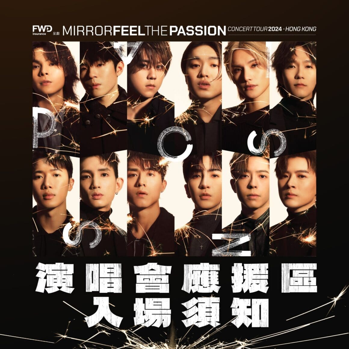 觀看《 MIRROR “FEEL THE PASSION CONCERT” 巡迴演唱會》需注意,演唱會內嚴禁攜帶任何影響或妨礙他人視線及欣賞本演唱會的物件進場,包括但不限於 38 × 30 × 20 厘米以上手提包/背包、大面積燈牌(燈牌最大體積為 38 x 30 x 20 厘米)、自拍桿、氣球、旗幟、長傘及板凳等,主辦單位保留沒收上述物件至本演唱會完結的權利。如有上述限制物品,請寄存於場地之行李寄存服務櫃位或地下的自助儲物櫃箱。