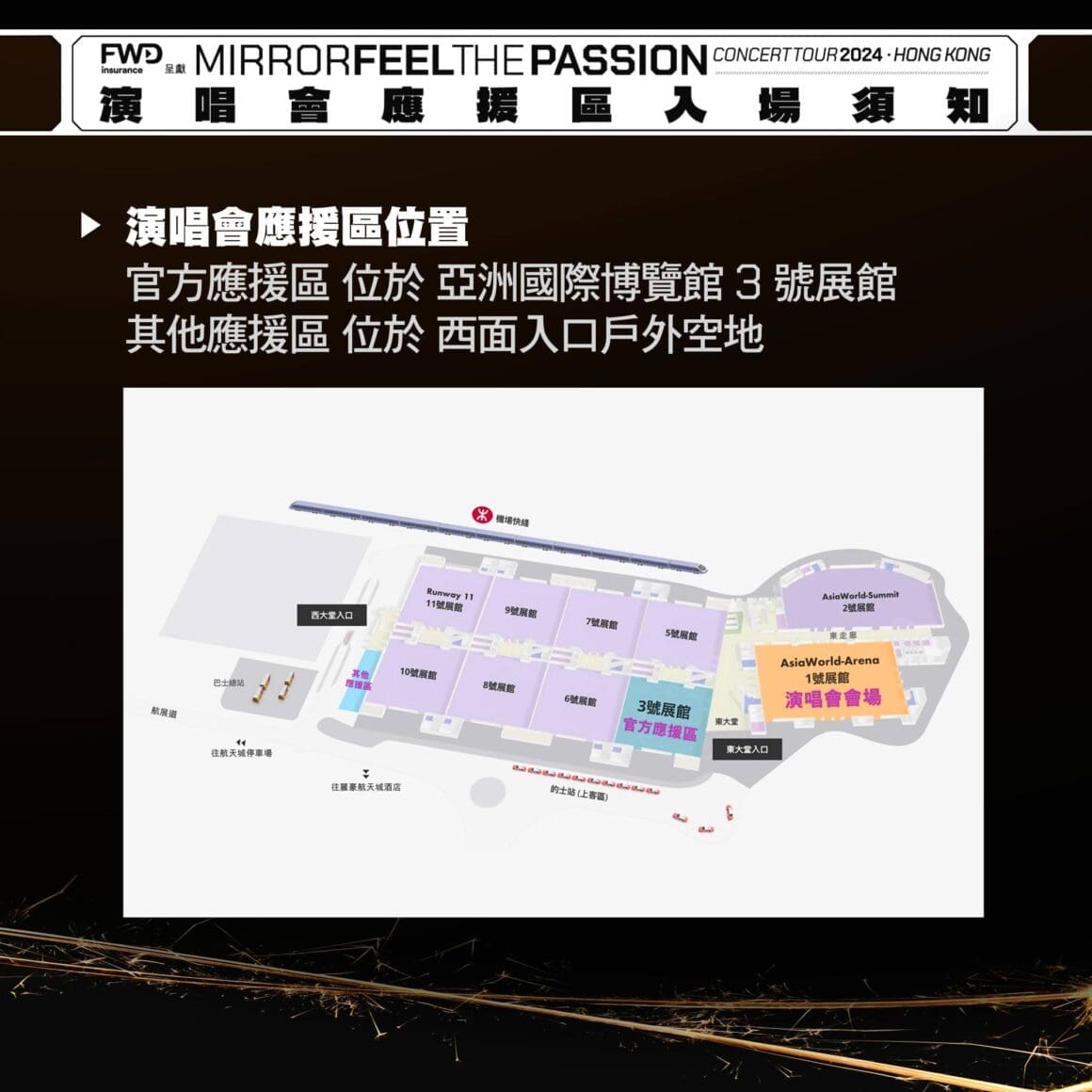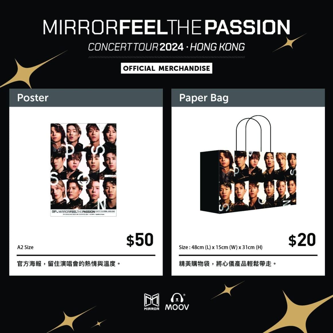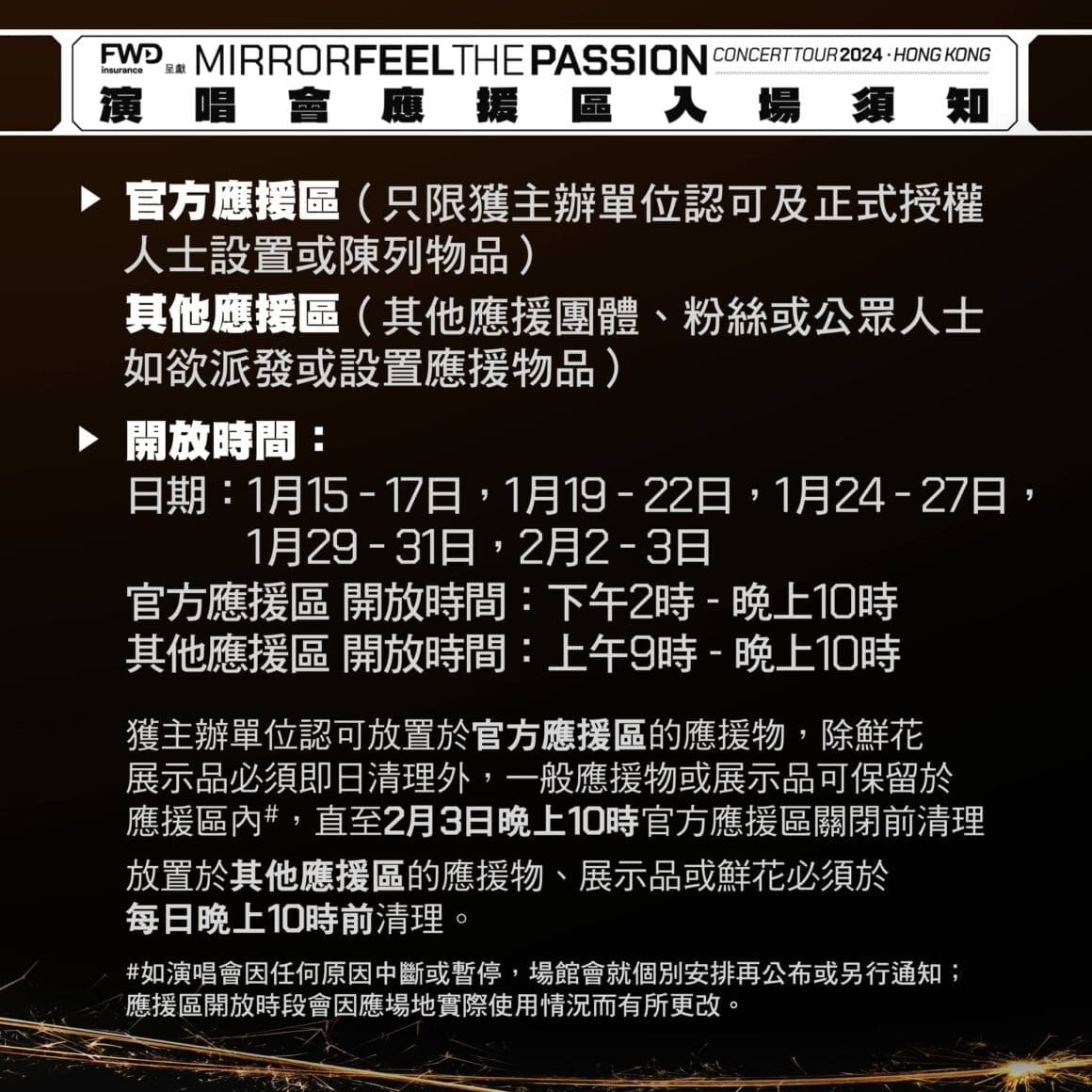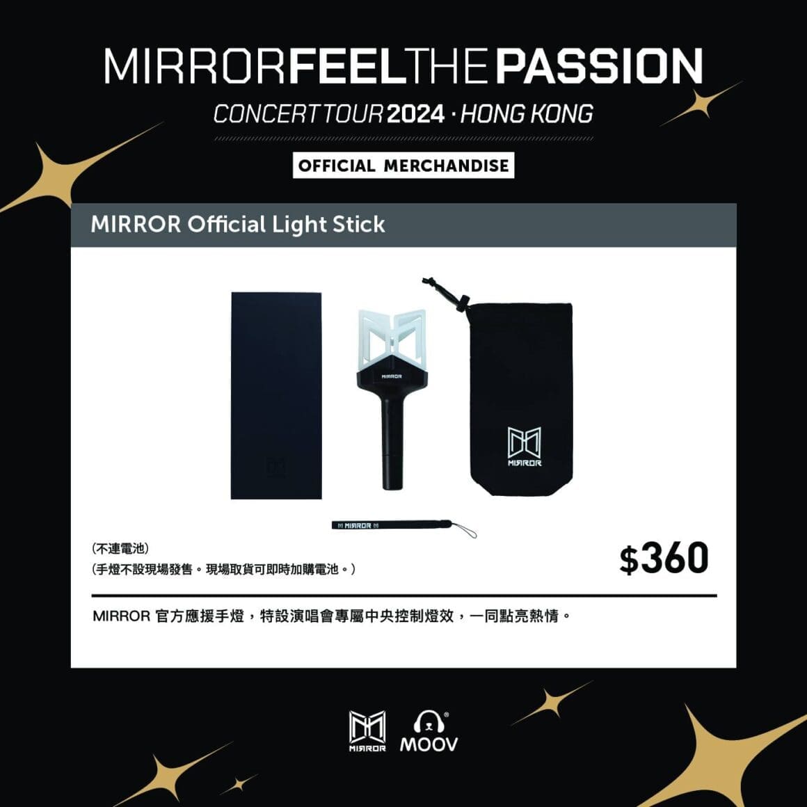 觀看《 MIRROR “FEEL THE PASSION CONCERT” 巡迴演唱會》需注意,演唱會內嚴禁攜帶任何影響或妨礙他人視線及欣賞本演唱會的物件進場,包括但不限於 38 × 30 × 20 厘米以上手提包/背包、大面積燈牌(燈牌最大體積為 38 x 30 x 20 厘米)、自拍桿、氣球、旗幟、長傘及板凳等,主辦單位保留沒收上述物件至本演唱會完結的權利。如有上述限制物品,請寄存於場地之行李寄存服務櫃位或地下的自助儲物櫃箱。