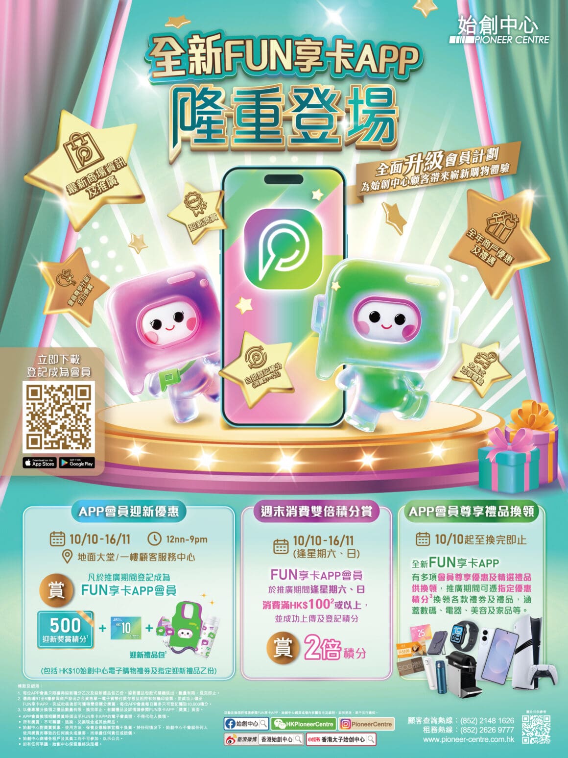 為慶祝 APP 正式上線及 FUN 享卡 15 週年誌慶,始創中心推出 「繽 FUN 15 週年」五重賞活動,禮遇豐富包括迎新獎賞、週末雙倍積分、激筍禮品換領及大抽獎,送出總值逾港幣 $50,000 獎品,當中更包括最新 iPhone 17 Pro Max!