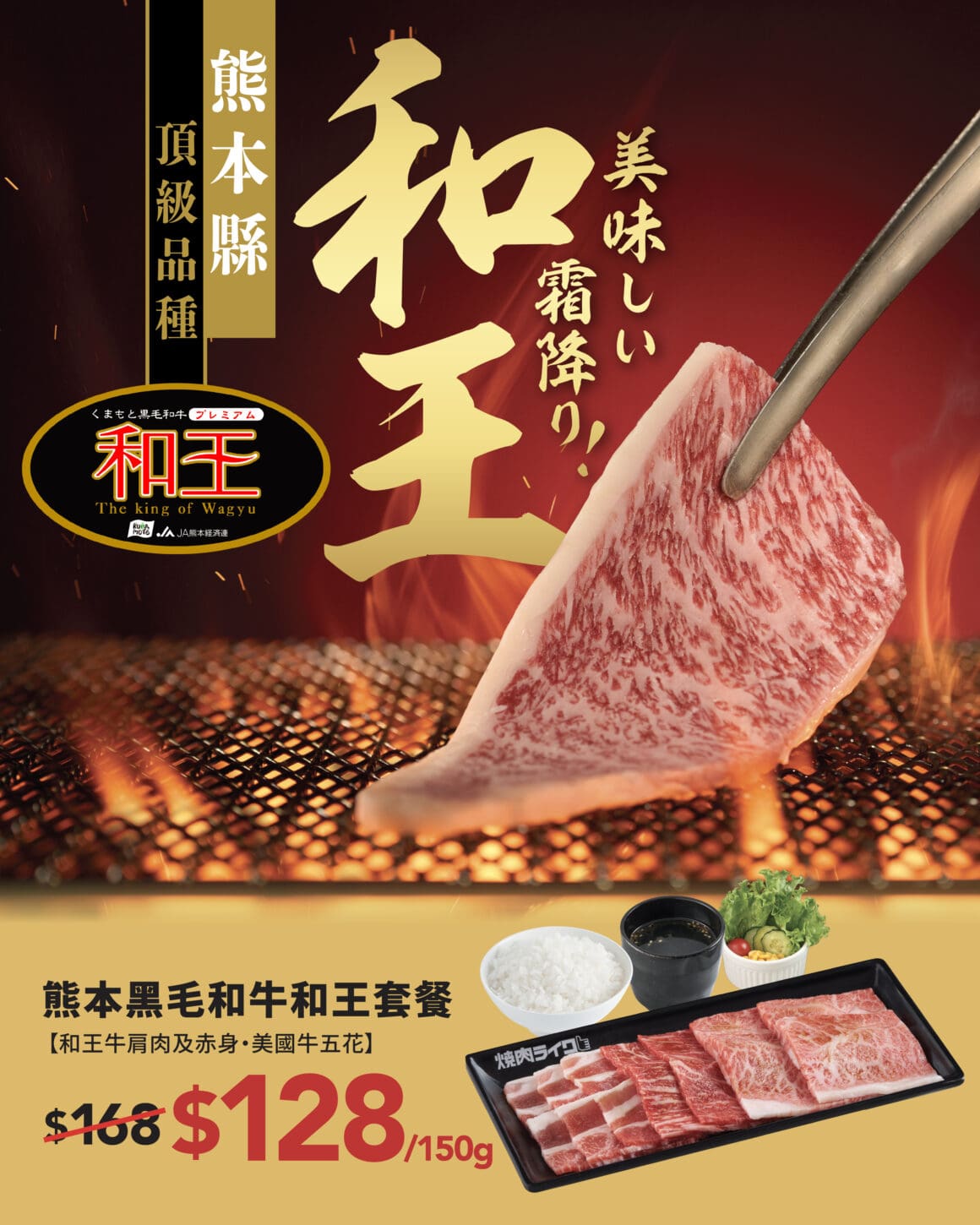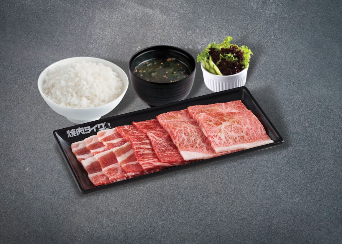 為慶祝五周年,「燒肉LIKE」引入日本熊本縣最高級別黑毛和牛「和王」,推出期間限定「熊本黑毛和牛和王套餐」。此套餐採用日本 A4 等級的和牛,特選生長超過 28 個月、經精選飼料養育及大理石花紋達到 6 級以上的頂級牛肉,「和王」和牛產自含豐富天然資源及純淨水源的原始環境,由專業生產者細心飼育。牛肩肉油花均勻細膩,肉質柔軟略帶嚼感,赤身肉味鮮甜濃郁,配以美國牛五花的肥瘦相間和細嫩多汁,三重口感完美融合。套餐價格港幣 $128( 150g )起,可搭配白飯、自選湯品及前菜,性價比極高。此外,推廣期間亦可優惠價港幣 $68( 50g )或港幣 $118( 100g )單點「熊本黑毛和牛和王」(肩肉及赤身),燒肉愛好者可自由烹調,享受極致滋味。