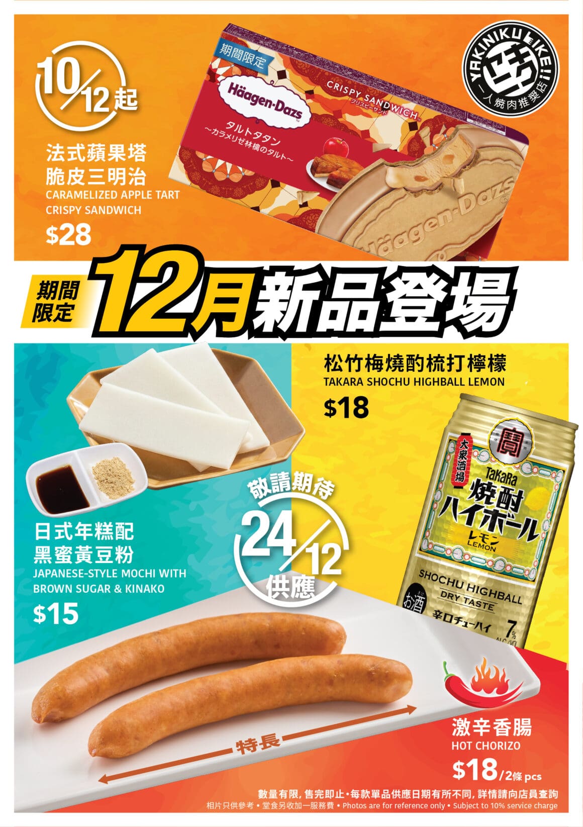 「燒肉 LIKE 」將於 12月 24 日起陸續推出三款期間限定新菜式,首推特長「激辛香腸」,選用多款辣椒及香料調味,外皮香脆,肉質飽滿多汁,辣味層層遞進,帶來強烈的辛辣享受,售價港幣 $18(兩條)。另有以知名日本燒酒品牌「松竹梅」為基底,搭配清新梳打水和新鮮檸檬汁調製的「松竹梅燒酌梳打檸檬」,酒精度適中,入口微酸帶甜,展現清爽口感,售價港幣 $18。壓軸為「日式年糕配黑蜜黃豆粉」,年糕採用小火烘烤至金黃微焦,外脆內軟Q彈,配以幼滑堅果香黃豆粉和甘甜醇厚黑蜜糖漿,售價港幣 $15。以上新品限量供應,為燒肉增添多層次味覺享受,推廣期至 2026 年 3 月下旬。