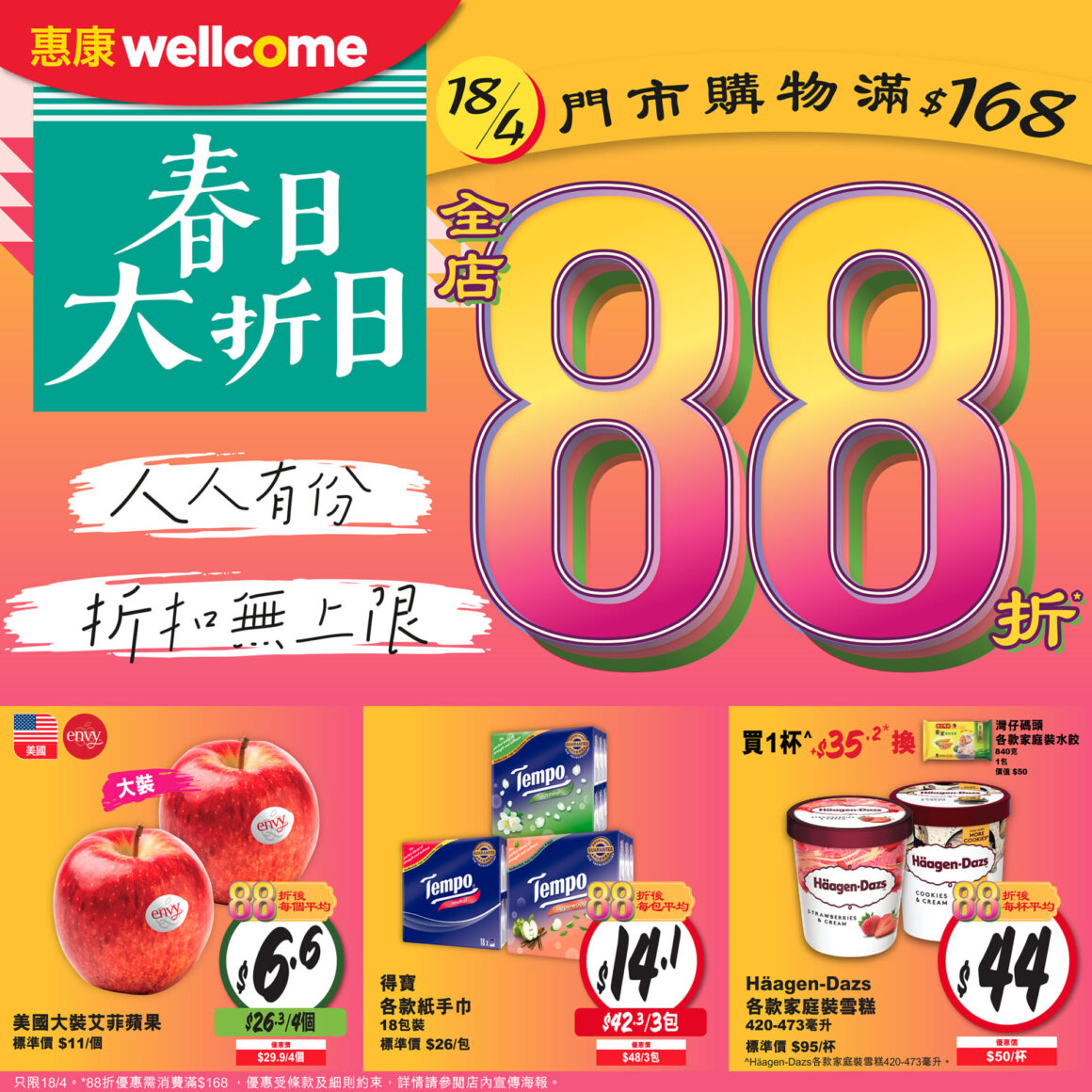 4 月 18 日(星期六)一日限定,全線惠康門市凡購物滿港幣 $168,即享全場 88 折。以下為當日部分精選限時推介(88 折後折實價):