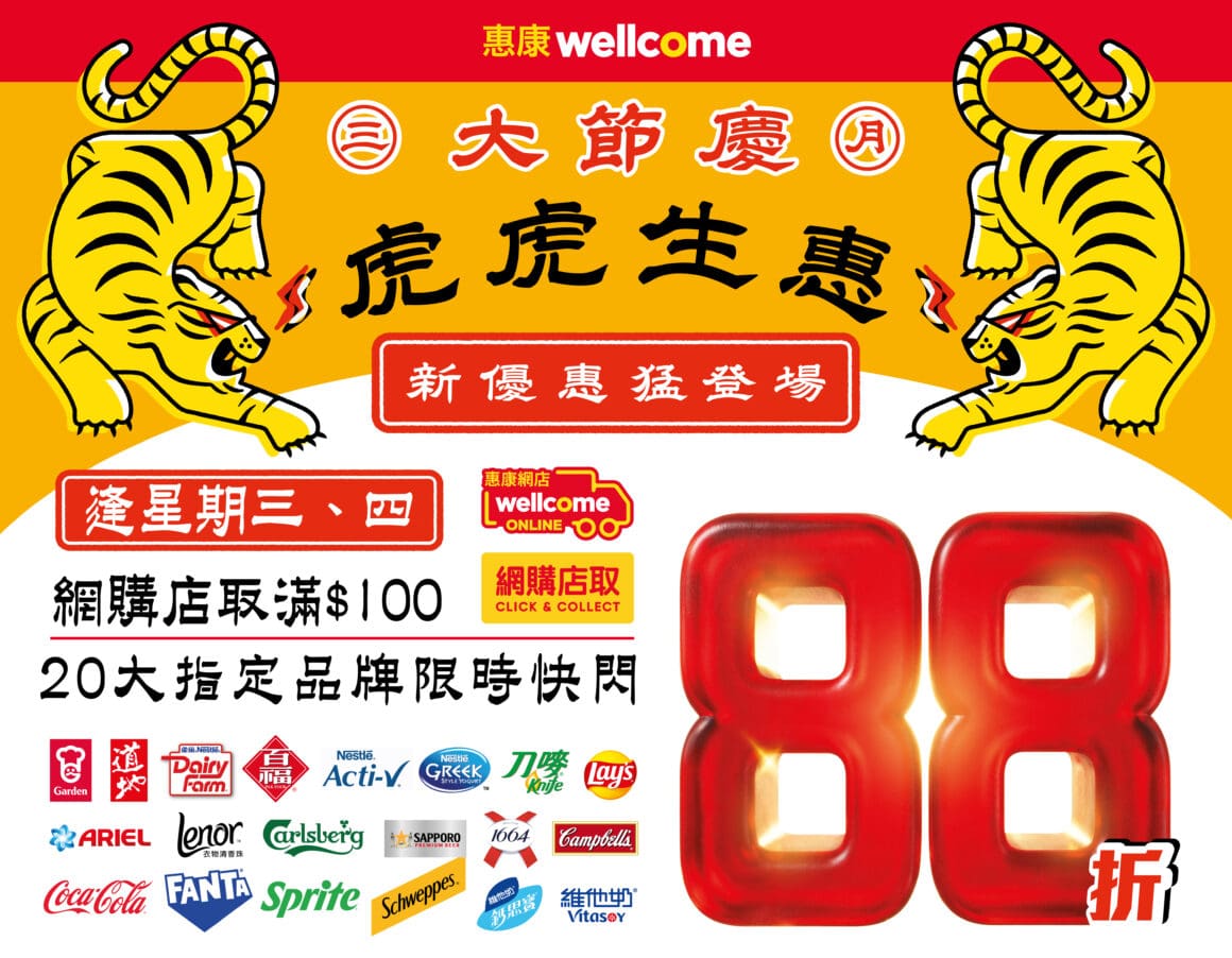 由 3 月 9 日起逢星期一至星期四,惠康推出「猛虎級」限時 88 折優惠。消費指定品牌滿指定金額即可享折扣。品牌包括嘉頓餅乾、道地、雀巢冷凍鮮牛奶、乳酪、乳酪飲品或百福豆類製品、刀嘜、 Ariel 、 Lenor 、金寶湯、可口可樂、芬達、雪碧、玉泉、樂事薯片、維他奶、鈣思寶、嘉士伯、七寶札幌及 K1664 等,一次過滿足不同家庭的日常所需。無論是入貨定補給,今次優惠檔期絕對是「虎」氣滿滿、慳到盡的好時機!