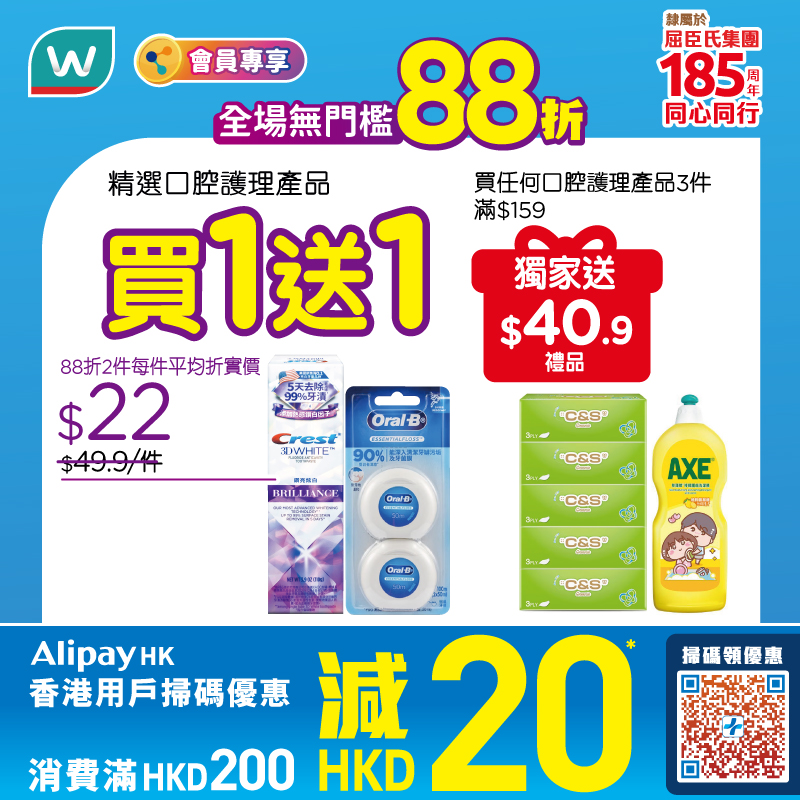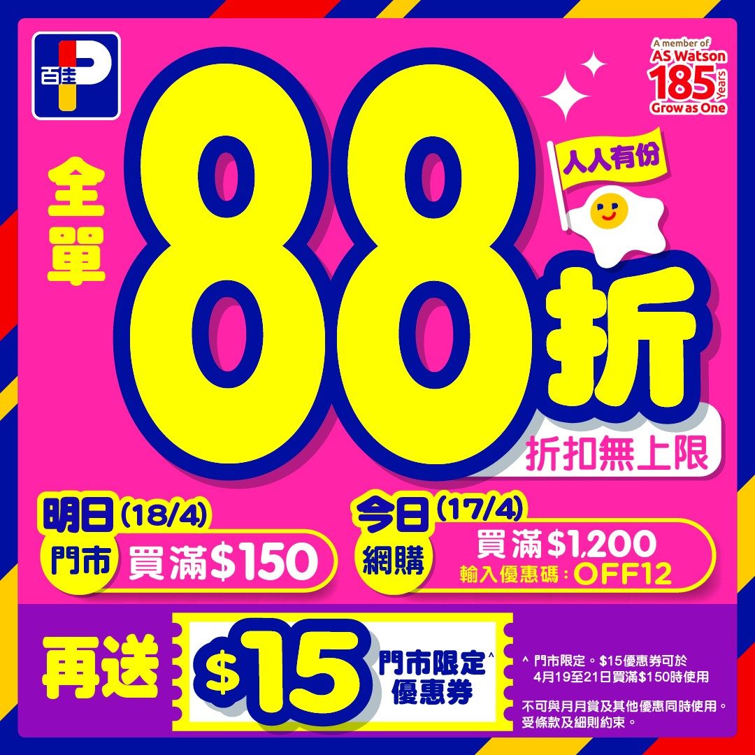 百佳於 4 月 18 日在全線門市(包括 FUSION、TASTE、INTERNATIONAL 等旗下品牌)推出快閃優惠,單一消費滿港幣 $150 即享全單 88 折,折扣不設上限。購物同時獲贈港幣 $15 優惠券,可於 4 月 19 日至 21 日再次購物滿港幣 $150 時使用。