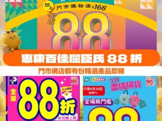 惠康、百佳及屈臣氏三大連鎖店於 4 月 18 日(星期六)同步推出一日限定 88 折快閃優惠,涵蓋超市糧油雜貨、個人護理及美容保健產品,合資格消費滿指定門檻即享全單折扣,部分商戶更提供折上折及優惠券回贈。