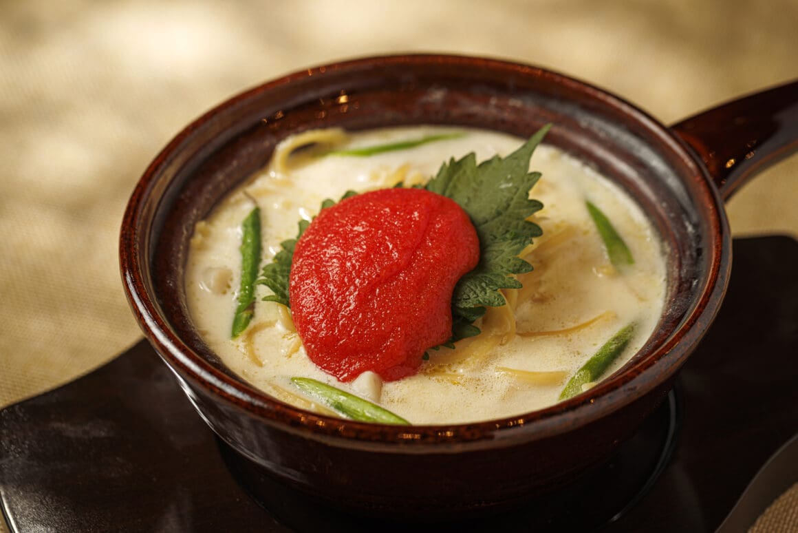 以石鍋盛載,鋪上輕盈梳乎里荷蘭醬,配合秘製味噌和風醬汁,賣相與味道兼備。